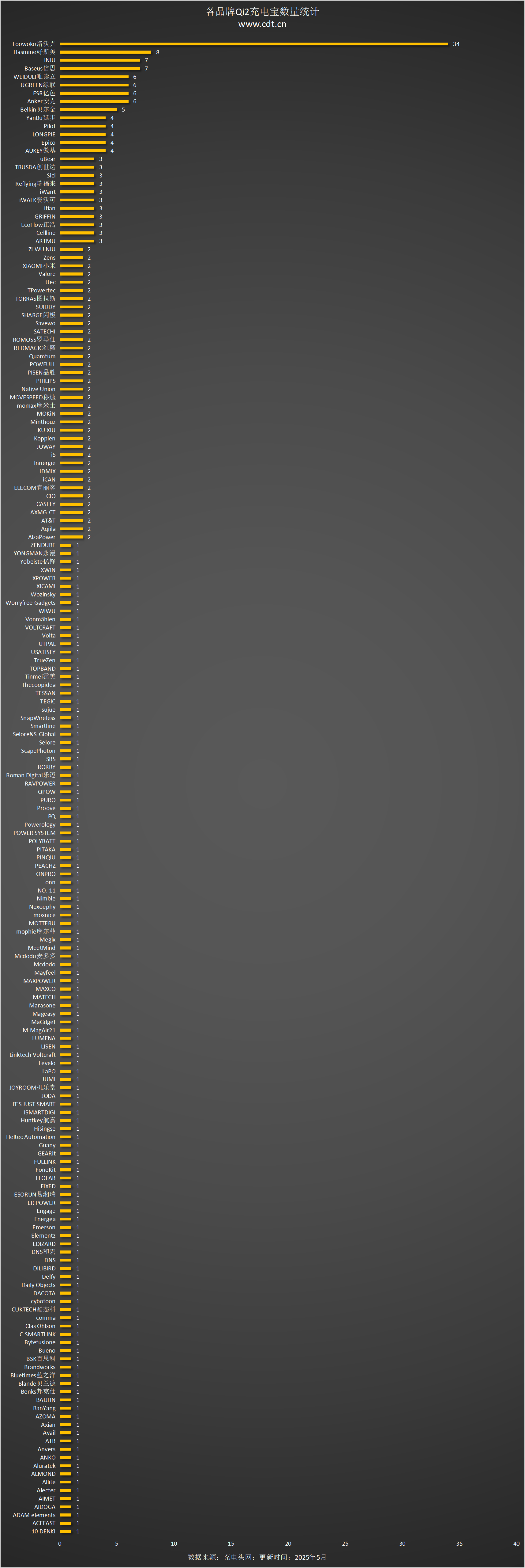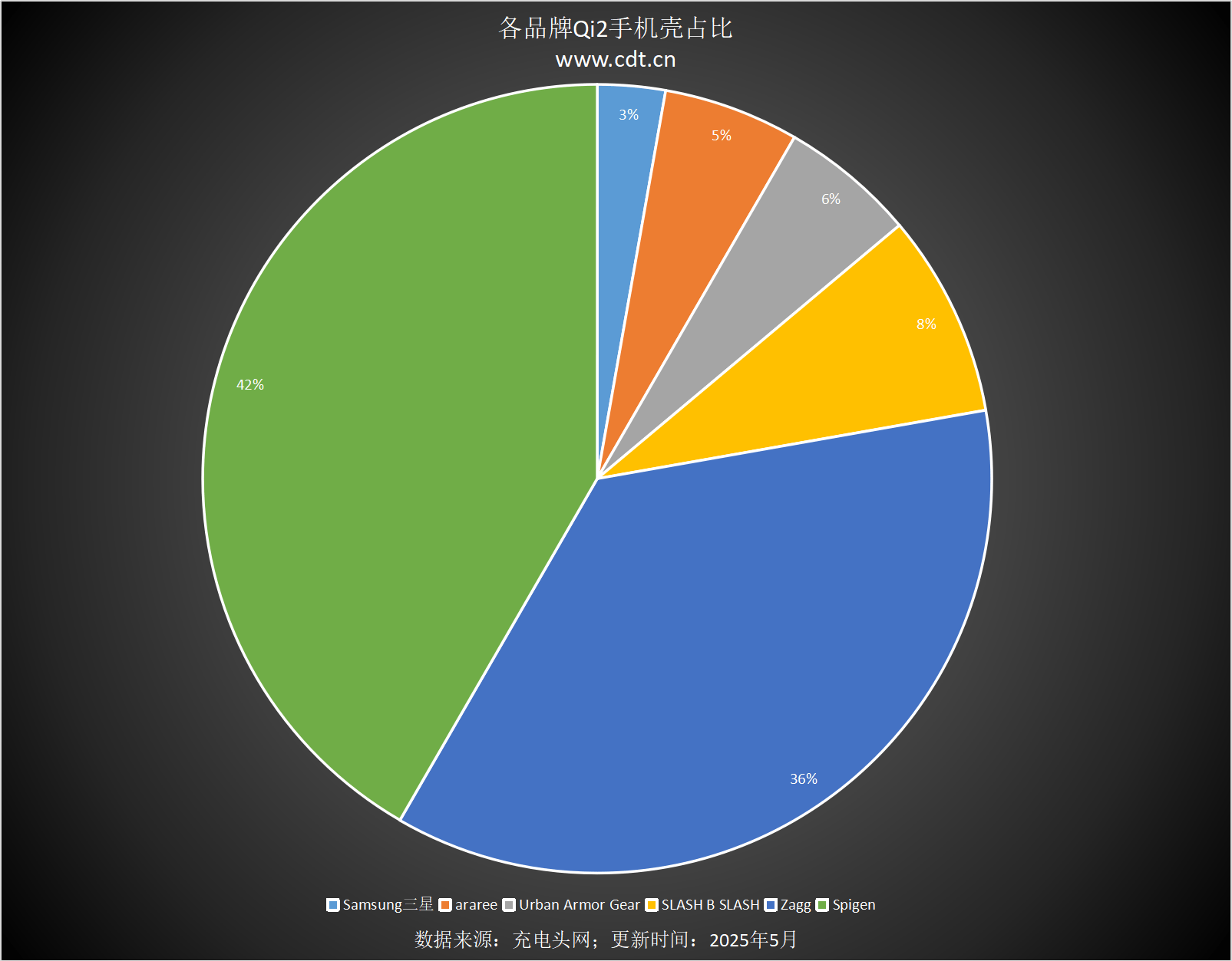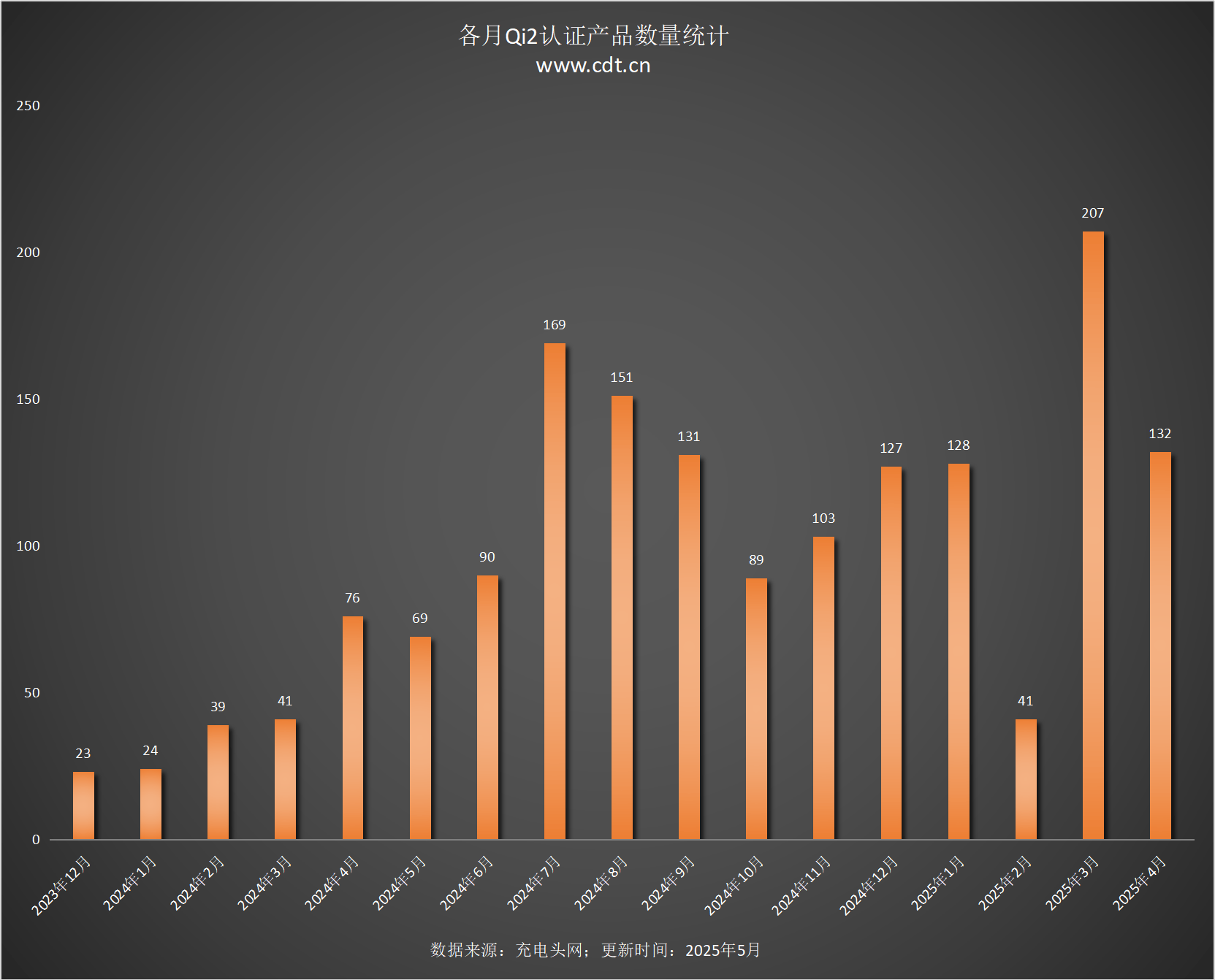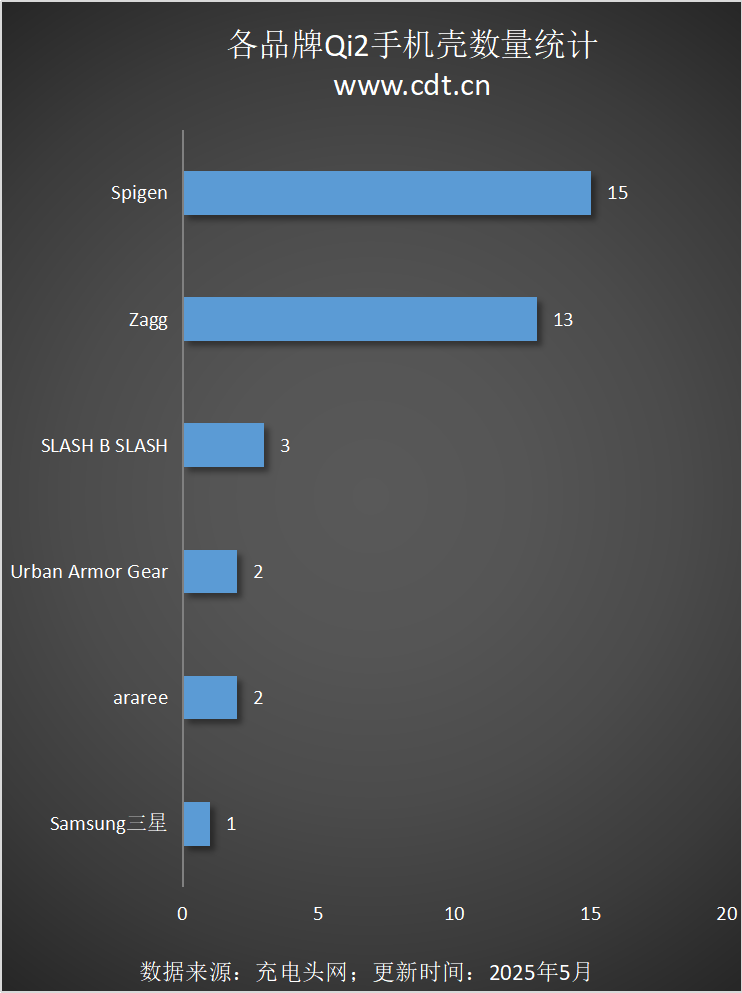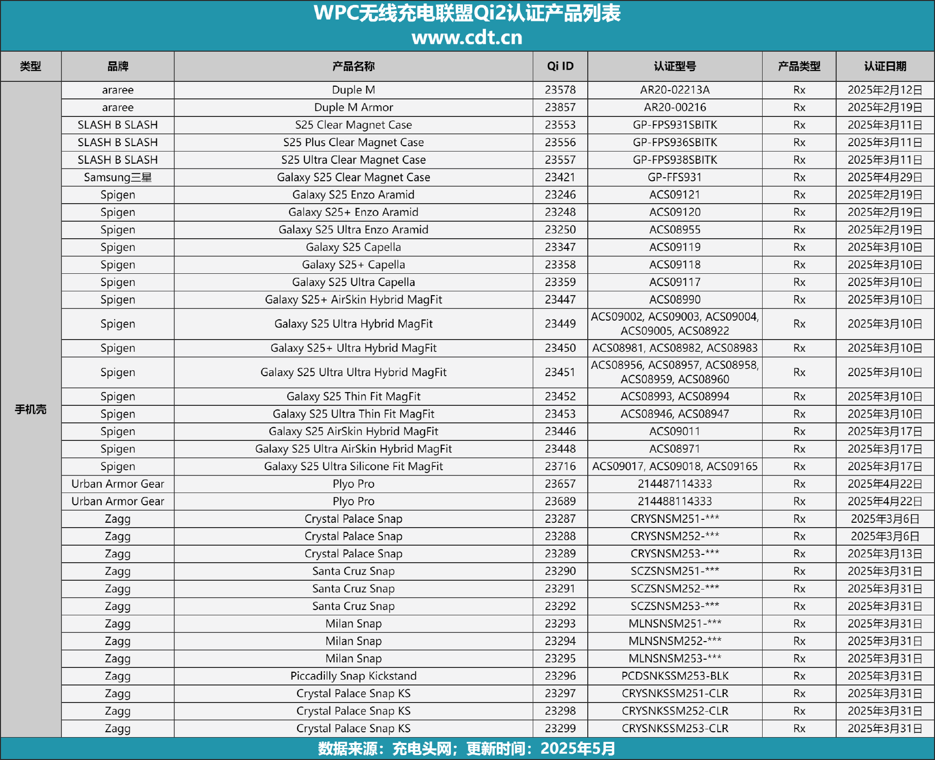 截至2025年4月30日,其次为充电宝产物,2025年4月份有132款产物通过Qi2认证,目前通过Qi2认证的充电宝品牌很是多,苹果和三星最新旗舰手机曾经通过Qi2认证,目前通过认证的Qi2手机壳,有182个品牌,从类型占比饼图能够看到多功能无线充、充电宝取桌面充占比前三,